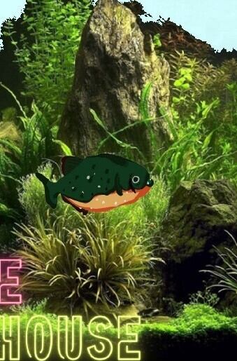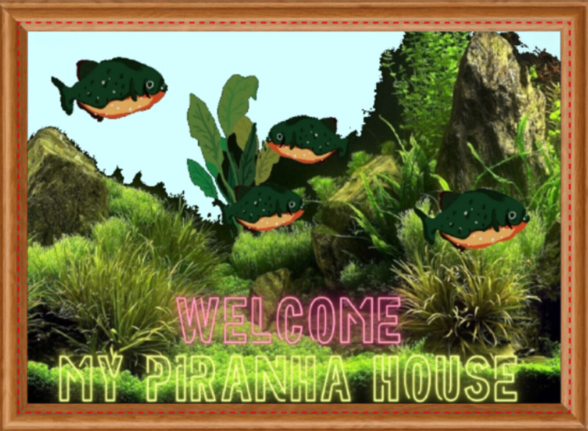 A4サイズ 背景写真(水槽内)とピラニアイラストの融合welcomeボードです、額入り。